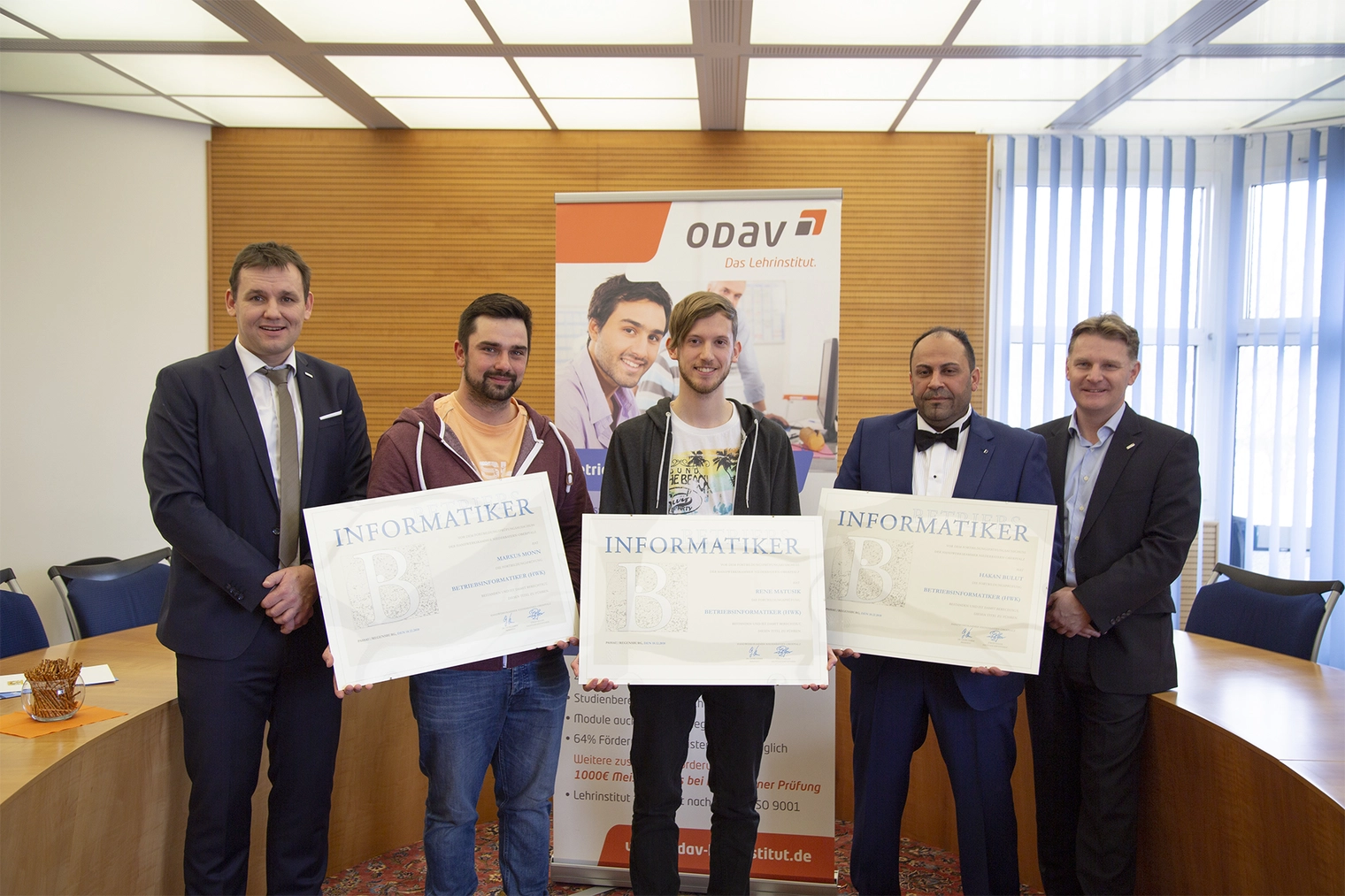 „Durch die Aufstiegsfortbildung zum Betriebsinformatiker (HWK) haben die Absolventen die Basis gelegt, um als IT Fach- und Führungskraft die digitalen Abläufe der Unternehmen mitzugestalten“ lobte Höllinger die Absolventen, die in den letzten Monaten ihre Zeit dafür verwendet haben, intensiv zu lernen. Hauptinhalte der Weiterbildung waren sowohl die Erstellung und Optimierung von unternehmensspezifischen MS Office-Anwendungen und die Erstellung und Administration von Internetauftritten als auch umfangreiche Administrationsaufgaben in EDV-Netzwerken und die Programmierung im Softwarebereich. „In unserer globalisierten Welt gewinnen Fortbildungen gerade im IT-Bereich immer mehr an Bedeutung. Der Abschluss zum Betriebsinformatiker stärkt die eigene Position im Beruf und macht sie zukunftssicherer“ fügte Jürgen Uttendorfer, Geschäftsbereichsleiter des Lehrinstituts, hinzu. Die Weiterbildung zum Betriebsinformatiker ist gleichzusetzen mit dem Meisterbildungssystem im Handwerk. Absolventen des Kurses Betriebsinformatiker sind berechtigt, an Universitäten und Hochschulen für angewandte Wissenschaft zu studieren. Die Maßnahme ist wie der Meisterkurs nach dem Aufstiegs-Bafög förderbar“. Besonders erwähnenswert ist die Leistung des Absolventen Rene Matusik. Er erhielt den Meisterpreis der Bayerischen Staatsregierung und gehört somit zu den besten Prüfungsteilnehmern dieses Lehrgangs. Das Bild zeigt die Absolventen mit den Gratulanten (v.l.): Kursleiter Jürgen Uttendorfer, Markus Monn, Rene Matusik, Hakan Bulut, Vorstand ODAV AG Armin Höllinger